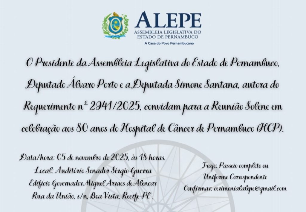 Em celebração aos 80 anos do Hospital de Câncer de Pernambuco (HCP), a Assembleia Legislativa do Estado de Pernambuco (Alepe) promoverá uma reunião solene na próxima quarta-feira (05/11), às 18h, no auditório Senador Sérgio Guerra, sede da Alepe.