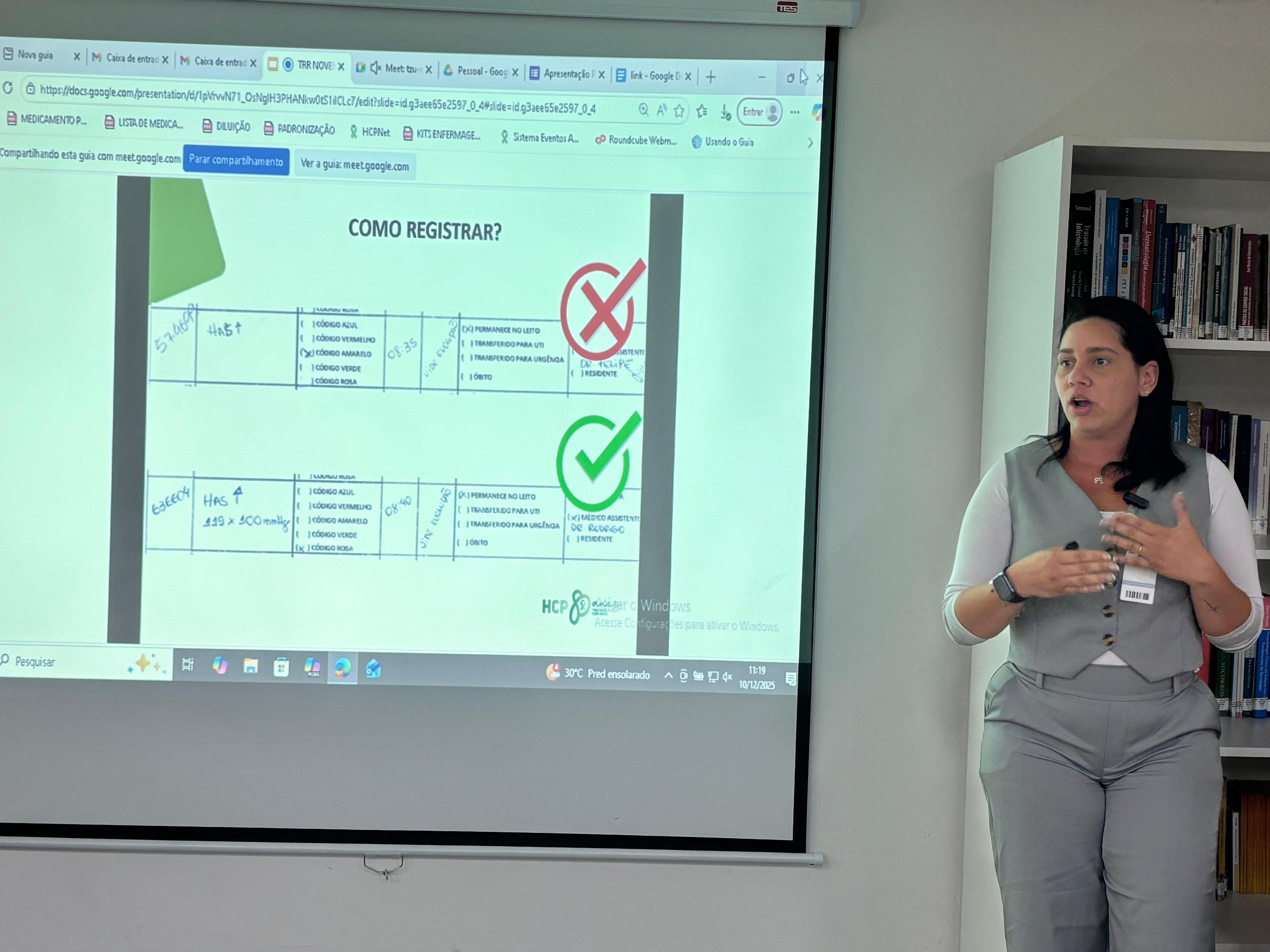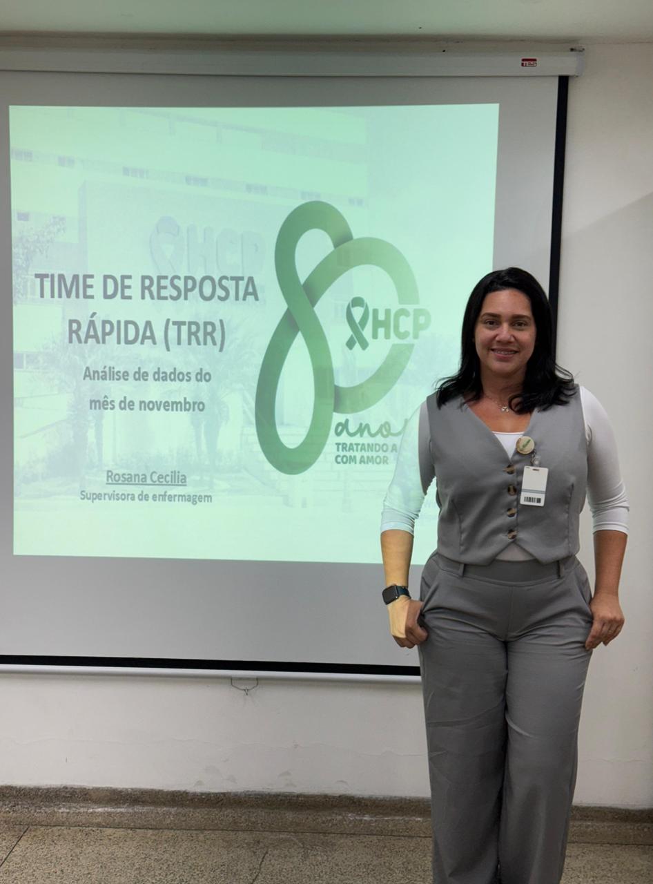 A apresentação foi conduzida pela supervisora de Enfermagem Rosana Cecília, gestora do Protocolo NEWS e do TRR no HCP, representando a Gestão de Enfermagem. Durante o encontro, foram compartilhados dados, indicadores e análises que permitem identificar avanços, desafios e oportunidades de melhoria no atendimento às intercorrências hospitalares.
