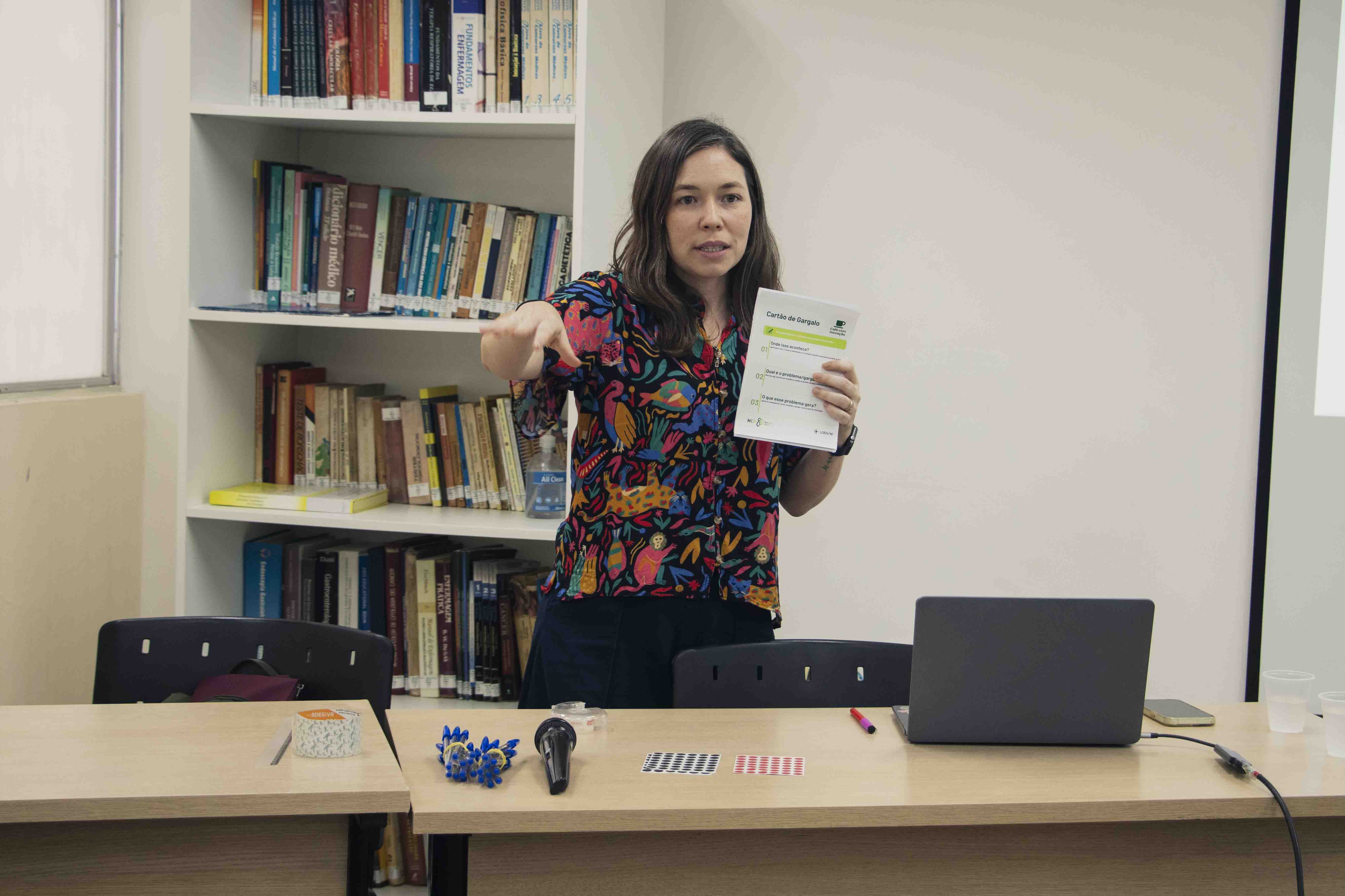 A proposta do workshop utilizou a abordagem de Design Thinking para compreender o cenário institucional. Como parte da metodologia, foi realizada a dinâmica “cartão de gargalo”, voltada ao mapeamento dos pontos prioritários a serem trabalhados pelo Programa de Inovação. Na atividade, cada participante respondeu a três perguntas-chave: “onde isso acontece”, “qual o problema ou gargalo” e “o que esse problema gera”.