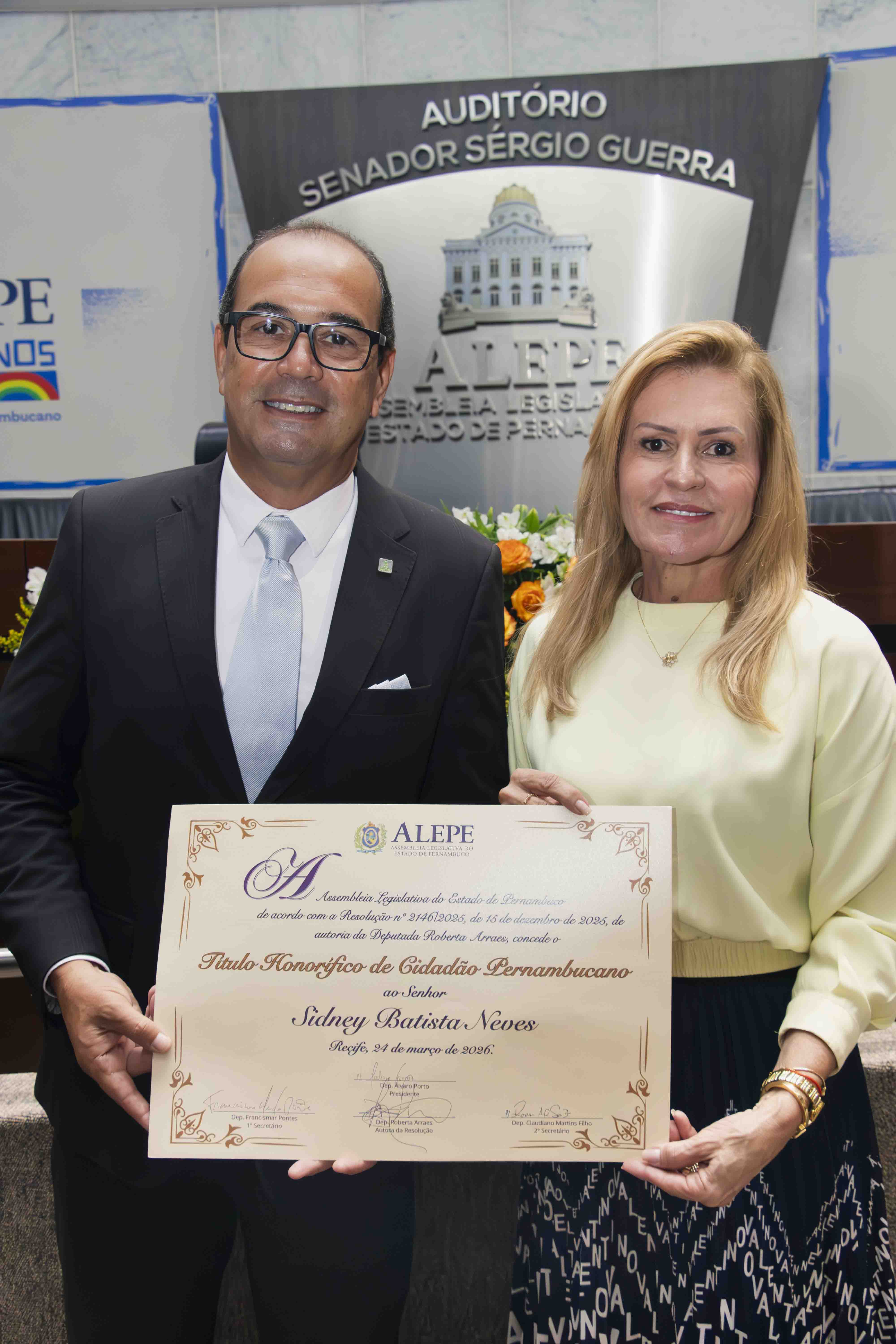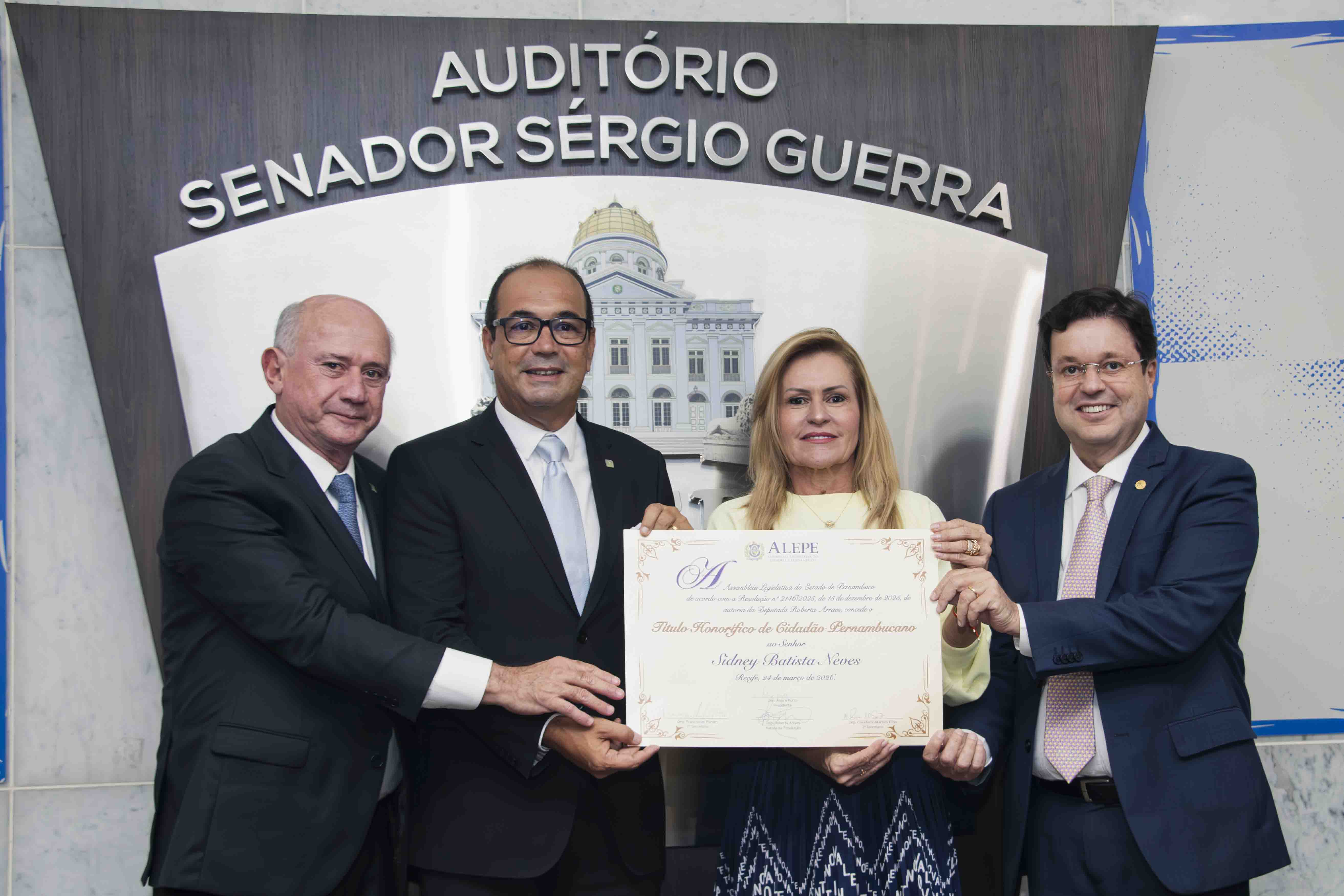 O superintendente geral do Hospital de Câncer de Pernambuco (HCP), Sidney Batista Neves, recebeu, na noite da última terça-feira (24), o título honorífico de Cidadão Pernambucano, em solenidade realizada no auditório Senador Sérgio Guerra, na Assembleia Legislativa de Pernambuco (Alepe), no Recife. A homenagem foi proposta pela deputada estadual Roberta Arraes, em reconhecimento à contribuição do gestor para o fortalecimento da assistência oncológica no Estado.